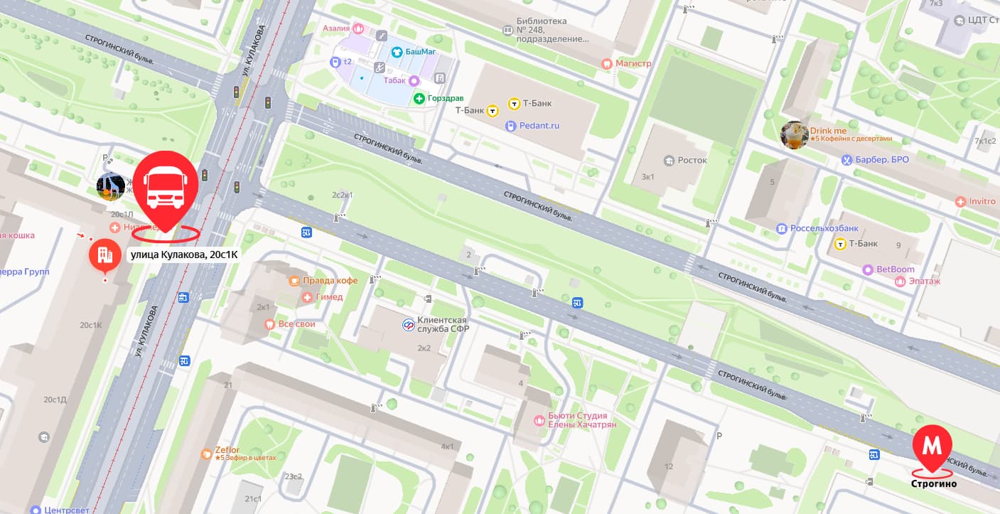 В связи с ремонтом на Строгинский бульваре, посадка на маршрутку осуществляется на остановке общественного транспорта "Строгинский бульвар", по адресу ул. Кулакова 20С1К.